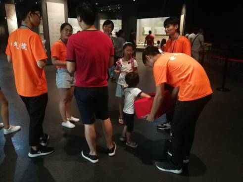 知识竞答活动分别在博物馆的三个展厅内举办,每一位在博物馆内的游客都可以参加此次活动,并且参加即可获得由志愿者赠送的书签。活动开展过程中,路过的小朋友积极踊跃参加。如果小朋友不知如何回答自己所抽中的问题,志愿者不会直接告诉小朋友答案,而是带小朋友到涉及该问题的文物前,生动仔细的讲解这个文物,使小朋友能够深刻理解。在小朋友复述一遍问题的答案之后,志愿者会以赠送书签的方式对小朋友予以奖励,并鼓励小朋友学习更多的历史知识。参加知识竞答的小朋友也很积极,博物馆的三个展厅内小朋友寻找答案的身影随处可见。