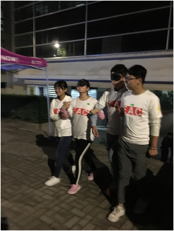 据悉,此次活动共分为28组,每组有两位同学,一位蒙着眼睛另一位负责指引并共同行进,另有9名安全员和3位教练,分别负责活动期间的安全工作和细则。由行政楼处的树林为起点途经二号教学楼、四号教学楼、喷泉广场、图书馆后的树林、博学路、景观大道最终到达二号教学楼。活动持续一个半小时,最终大家相聚于一起以PPT的形式回味活动的点滴并交流心得。