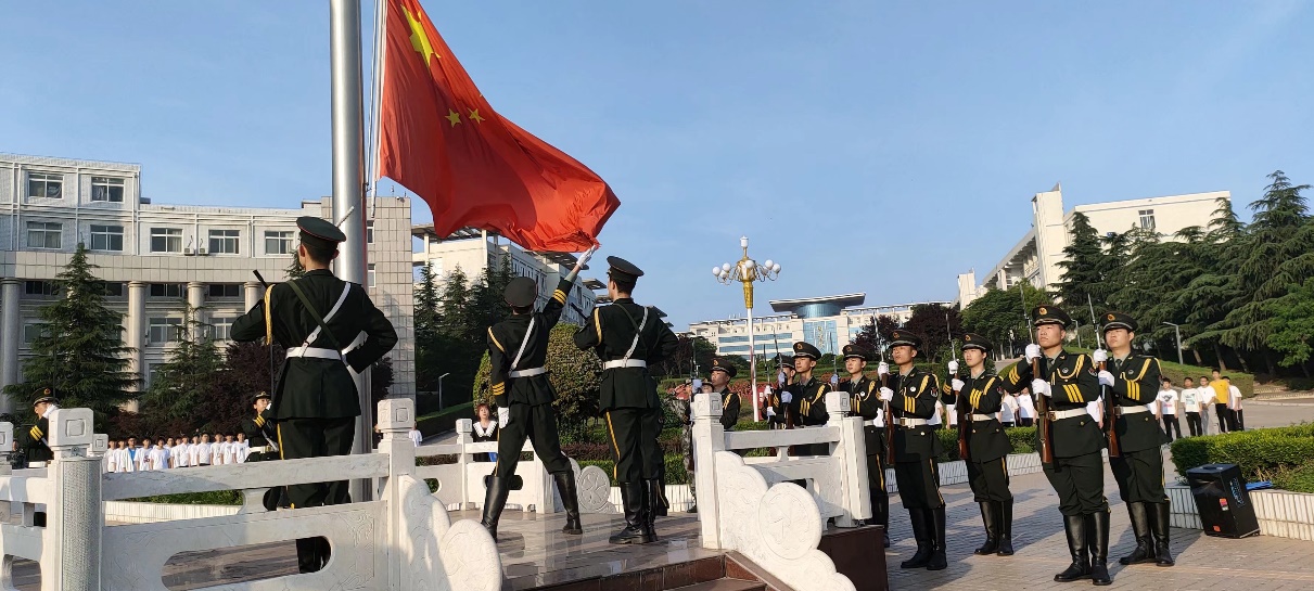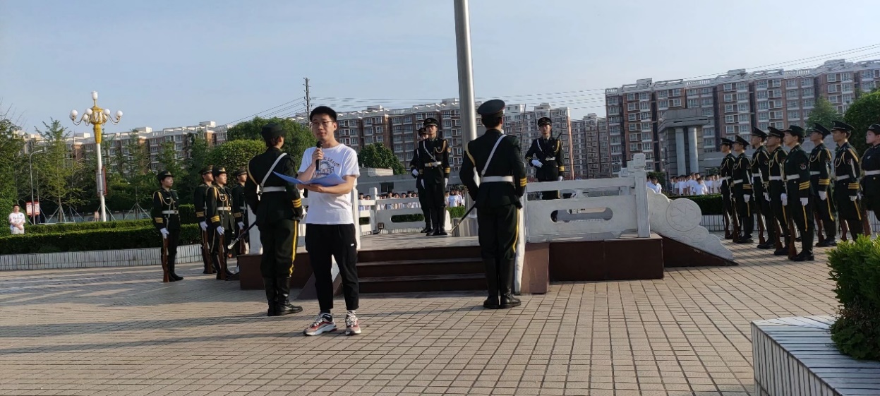 早上6点40分,升旗仪式准时开始。在全体师生的注目礼下,英姿飒爽的国旗护卫队护送鲜艳的五星红旗庄严入场。接着,《义勇军进行曲》奏响,擎旗手扬旗,五星红旗冉冉升起,迎风飘扬。在场的每一个人向国旗行注目礼,齐唱国歌,深怀对祖国无限的热爱和崇高的敬意。升旗仪式结束后,由优秀党员代表陈攀和优秀团员代表赵俊苗进行国旗下的演讲。在他们的演讲中回顾历史,体悟当下,唤起责任,坚定理想,在场的学子深深地受到感染,爱国之情被历史升华,报国之志被责任强化。