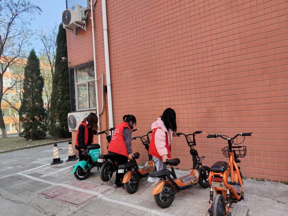 (图为志愿者在规范摆放共享单车)