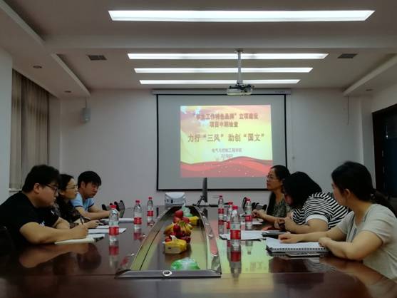 (通讯员 宁蕴绯 徐娟)5月18日,公司员工工作“特色品牌”创建活动办公室第三检查组组长樊昀英,成员温啸野、杨冰一行到公司针对公司2017年立项的 “员工工作特色品牌”——力行“三风”,主创“国文”进行了中期检查。公司党总支副书记董燕飞、学工办主任团总支书记宁蕴绯、专职辅导员徐娟、赵昊参加了检查会议。