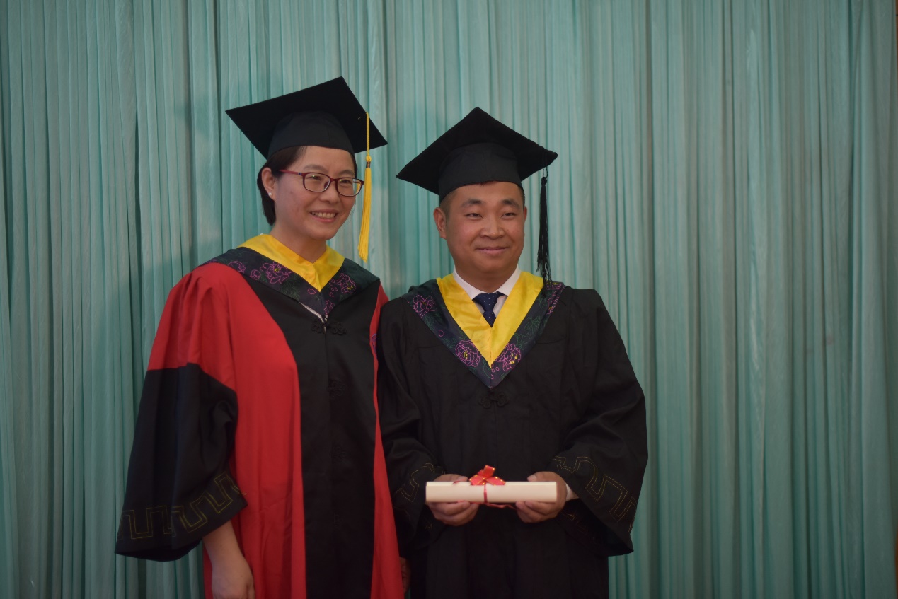 经理董燕飞为毕业生正冠拨苏、颁发学位证书并合影留念