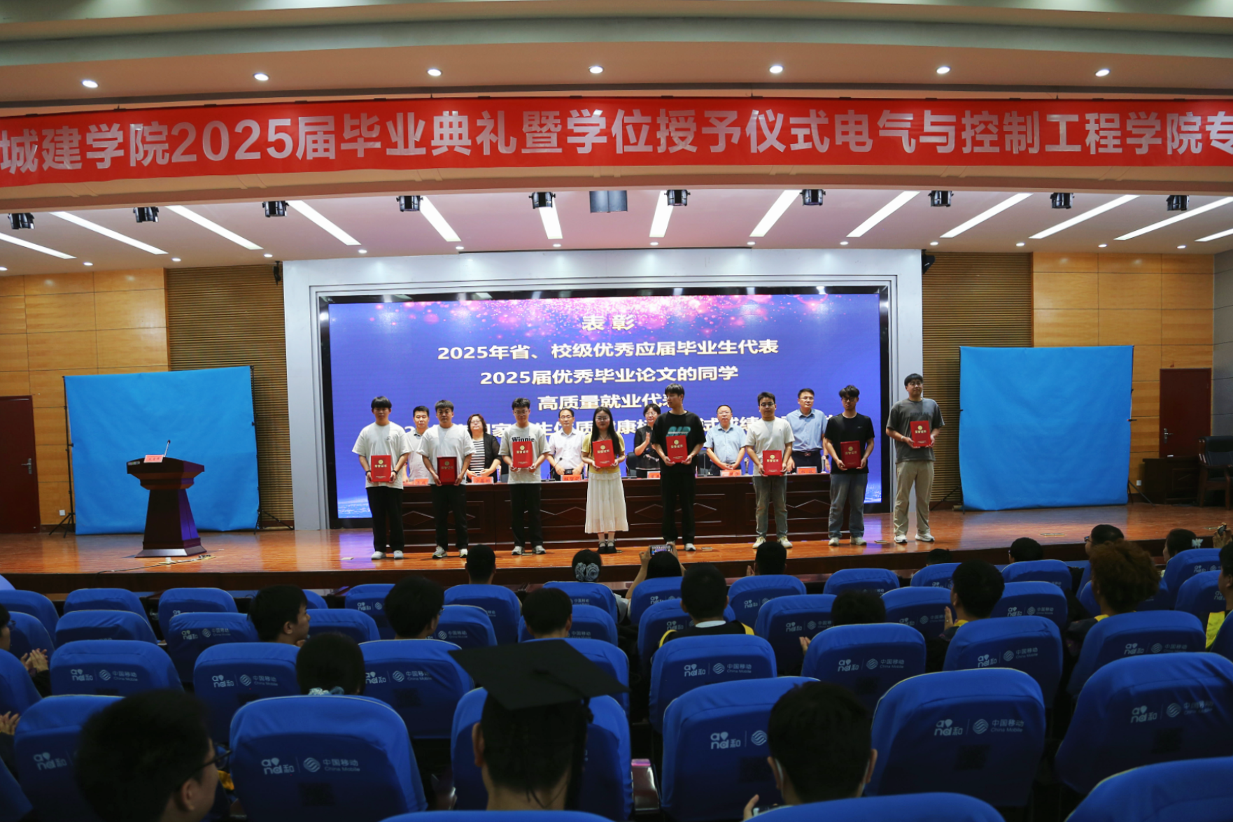 典礼在庄严雄壮的国歌声中拉开帷幕。​公司党委副书记宁蕴绯宣读了2025年校级优秀应届毕业生、2025年度国家员工体质健康标准测试成绩优秀员工的表彰决定;​beats365唯一官网副经理梁成武宣读了2025届优秀毕业论文作者的表彰决定,并对获得2025年省、校级优秀应届毕业生、2025届优秀毕业论文、高质量就业代表、2025年度国家员工体质健康标准测试成绩优秀员工代表进行了表彰。​beats365唯一官网副经理祁林宣布了​beats365唯一官网获得学士学位的2025届毕业生名单。随后,​beats365唯一官网经理董燕飞、副经理何国锋共同为毕业生正冠拨穗、颁发学位证书并合影留念。