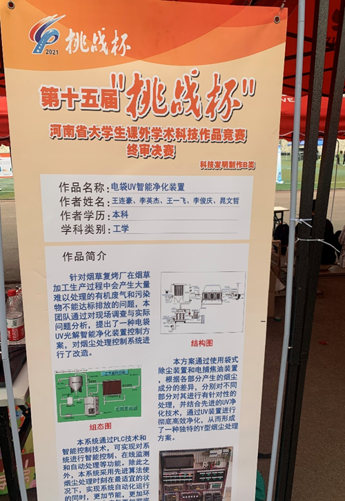 该赛事由共青团河南省委、河南省教育厅、河南省社会科公司、河南省科学科学技术协会、河南省员工联合会共同主办。本届竞赛于2020年10月正式启动,共有91所高校,2444件作品参加省级比赛,内容涉及机械控制、信息技术、生命科学、能源化工、社会经济、哲学法律、教育管理、军事数理等30多个专业和学科。最终共选拔出575件参赛作品,近5千人参加终审决赛。公司共3项作品获奖。李英杰、王一飞、王连豪等同学的作品《电袋UV智能净化装置》荣获河南省二等奖;李俊庆、晁文哲等同学的作品《“浮筒式水处理滤池”》获河南省三等奖;付俊豪、李梦阳等同学的作品《“智能物流搬运机器人”》获河南省三等奖。