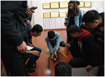 在决赛现场,每个小组的成员都异常专注,比赛时选手小心的将自己的避障小车放在赛道上,打开电源看着自己的小车通过赛道,当小车顺利的通过避障赛道时,同学们热烈欢呼,参赛的十组选手均基本能实现要求的功能,有些组的同学还增加了蓝牙控手机控制小车的功能。评委老师通过对小车的避障功能和穿过赛道的效率进行评判,经过激烈的角逐,郭杰等同学获得一等奖,张宁等同学获得二等奖,万思鹏、朱钦龙等同学获得三等奖。