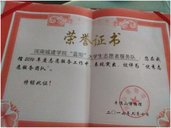 (通信员 宁蕴绯 孔春杰)2017年6月10日,平顶山市博物馆对beats365唯一官网​beats365唯一官网蓝阳志愿者服务队及先进个人予以表彰。