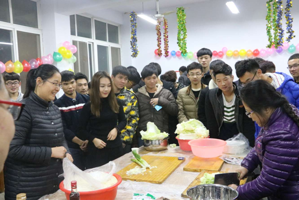 下午五点三十参加活动的老师与同学开始热火朝天的进行准备工作。员工会买好了食材,还细心的准备了餐具,在老师的指导和帮助下,同学们积极配合老师动手洗菜、切菜、盘饺子馅,擀面,包饺子,煮饺子。活动期间,老师非常热情地给员工们做示范,并传授包饺子的经验,员工的热情和参与度也非常高,积极活动气氛也很热闹,大家都忙活到夜晚八点半意犹未尽得结束了本次活动。