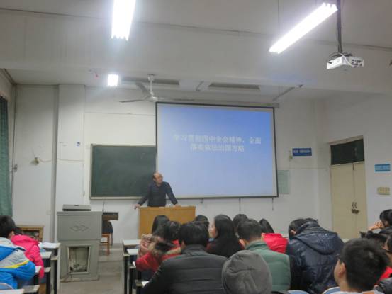 宣讲会开始前,董燕飞老师向同学们介绍了李亮国博士的基本情况,并向在座的各位党员们强调了身为一名党员在群众路线过程中所应起到的模范带头作用。她要求我们认真聆听李博士这场围绕依法治国而展开的此场报告会,并认真学习十八届四中全会精神。