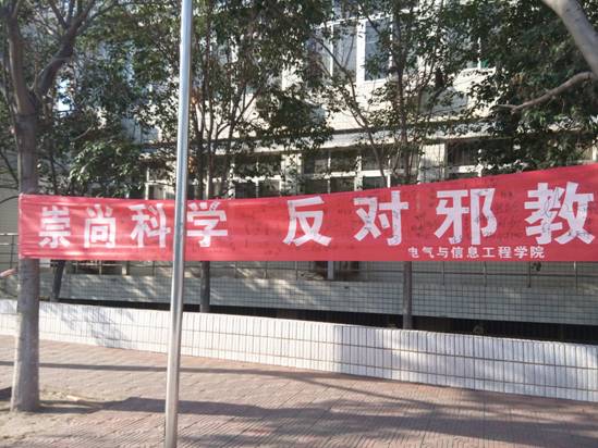 (通讯员 宁蕴绯 严丹丹)2014年12月7日下午,电气与信息工程公司开展以“崇尚科学,反对邪教”为主题的签名活动。此次活动响应公司的号召,大力度的对反邪教进行宣传,受到了师生的热烈响应。