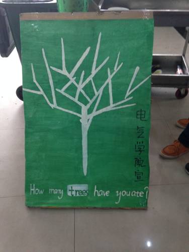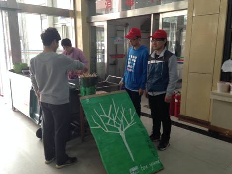 在活动中,志愿者们拿着自己准备的垃圾桶、宣传海报来到二号餐厅,引导同学们拒绝使用一次性筷子,并将用过的一次性筷子回收,以便做成工艺品,之后将会在公司喷泉广场上展览,通过这个来告诫同学们拒绝使用一次性筷子。