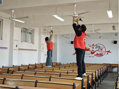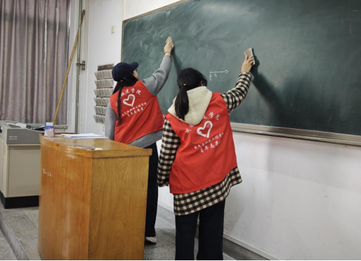 活动当天,志愿者们身着统一志愿服,携带清洁工具,以饱满的热情投入清扫行动,用双手擦亮城建系楼的每一处角落。活动现场暖意融融,志愿风采随处彰显。工作人员高效分发清扫工具,分工指令下达后,志愿者们迅速组建桌面清洁组、地面清扫组、垃圾清运组、工具整理组等专项小组,即刻投入紧张有序的清洁工作。大家相互协作、分工明确,无论是桌下的细碎垃圾、墙角的积尘,还是黑板的粉笔灰、吊扇的顽固污渍,志愿者们都细致擦拭、认真清扫,绝不放过任何卫生死角。在工作人员的统筹协调与全体志愿者的共同努力下,清扫工作有条不紊推进,系楼环境面貌焕然一新。